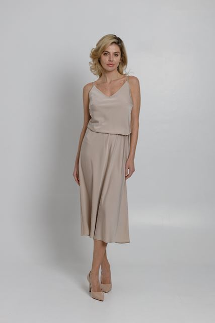 Спідниця довжини міді з високою посадкою, гарно фіксується на талії за рахунок еластичного поясу. Спідниця виконана без підклади (не просвічується). Комплектується топом з цієї ж тканини модель ДЧ-08
