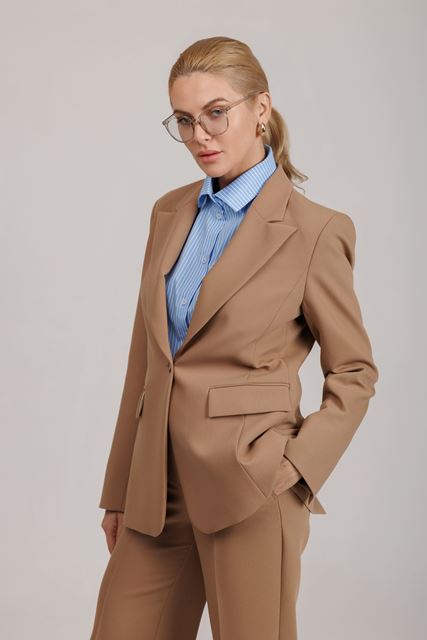 Жакет класичний, приталеного силуету довжиною 70-73см, на підкладці. Рукав довгий, прямий. Лацкан класичного крою, по пілочці функціональна кишеня. Застібка на ґудзик. По спинці та рукавах є шліца. Чудовий варіант для створення яскравого образу в діловому стилі. Поєднуються штанами з цієї тканини.