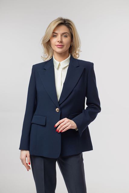 Жакет класичний, приталеного силуету довжиною 68-77см, на підкладці. Рукав довгий, прямий. Лацкан класичного крою, по пілочці функціональна кишеня. Застібка на металевий золотий ґудзик. По спинці та рукавах є шліца. Чудовий варіант для створення яскравого образу в діловому стилі. Поєднуються штанами з цієї тканини.