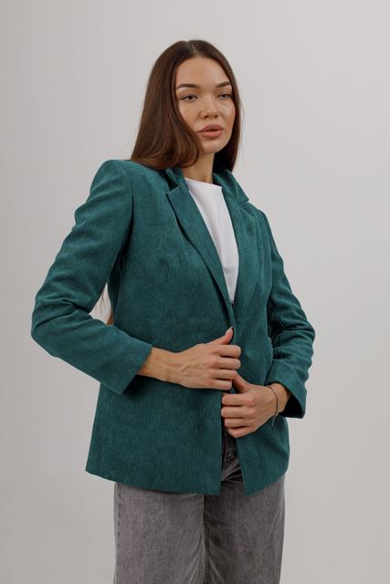 Жакет класичний, прямого силуету довжиною 66см, на підкладці. Рукав довгий, прямий. Лацкан класичного крою, по пілочці функціональна кишеня. Застібка в районі таліі на один ґудзик. По спинці є шліца 17см. Чудовий варіант для створення яскравого образу в діловому стилі.